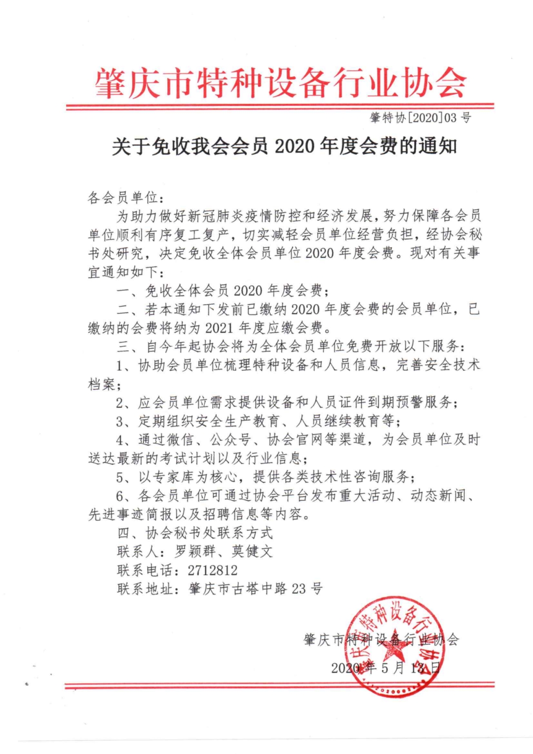 关于免收我会会员2020年度会费的通知