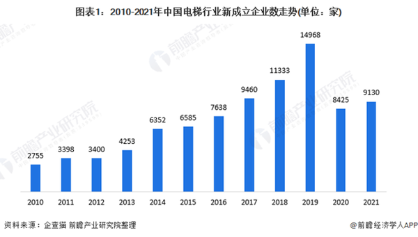 在城镇化持续发展、基础设施投资建设和旧楼加装电梯等动力推动下,我国电梯行业新成立企业数在2010-2019年呈现持续上升趋势,2020年受Covid-19的冲击有所回落。在2019年,中国电梯行业新成立企业数一跃到14968家;2020年,电梯行业新成立企业数量为8425家;截止到2021年7月11日,我国企业名称及经营范围包括但不限于中国电梯制造行业的在业或存续企业共计101053家。