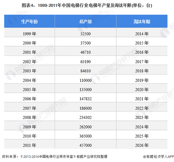 一般而言,三菱、日立等日本电梯的报废年限约在15年,奥的斯、迅达、通力等欧美电梯的报废年限在25年。由于我国电梯大部分标准都是参照日本标准设定,电梯报废年限也在15年左右。随着在用电梯使用寿命临近,预计未来旧梯更新需求将进一步增加。根据中国电梯行业商务年鉴统计数据,我国电梯的产销量及淘汰年限如下表所示: