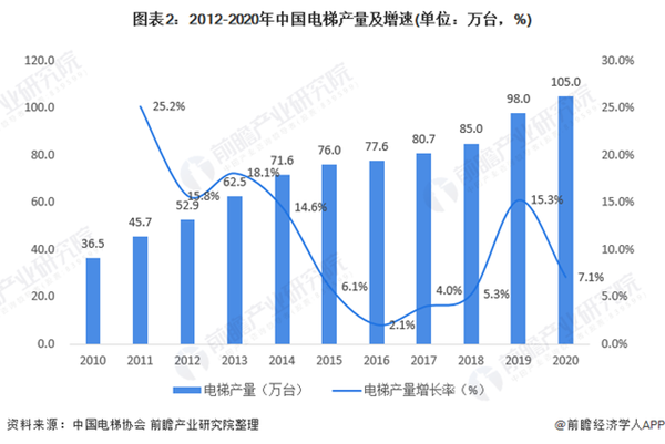 随着电梯企业数量的不断增加以及新装、换装市场的推动下,电梯行业产量逐渐增多。根据中国电梯协会数据,2010-2020年,中国电梯产量呈上升趋势,十年复合增长率达到11.4%。2020年我国电梯产量达到105万台,增长7.1%。