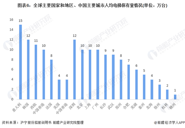 尽管我国电梯保有量较大,但人均保有量仍处于较低水平。2002年我国人均电梯保有量仅为约0.3台/千人;经过多年发展,截至2018年末,中国人均电梯保有量已经提升至约4台/千人,为同期意大利的1/4、韩国的1/3、法国的1/2。一线城市如深圳、北京、上海等地的电梯人均保有量分别为12台/千人、10台/千人、10台/千人,仍低于欧洲部分发达国家的平均水平。