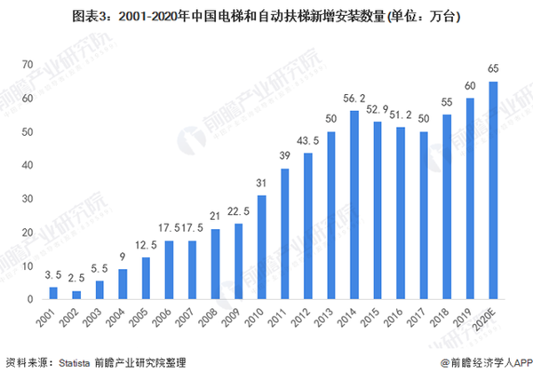 根据Statista的统计数据显示,2001-2019年,中国电梯和自动扶梯新增安装数量呈现波动上涨趋势,2019年电梯和自动扶梯新增安装数量为60万台。结合历史新装数量数据及保有量新增数量初步测算,2020年中国电梯和自动扶梯的新装数量约为65万台。