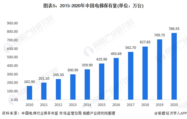 由于房地产、城市公共基础设施建设等产业发展迅速,中国新装电梯市场一直保持着高速增长,2015-2020年间,我国电梯登记数量逐年增多,2020年,我国电梯登记数量达786.55万台。