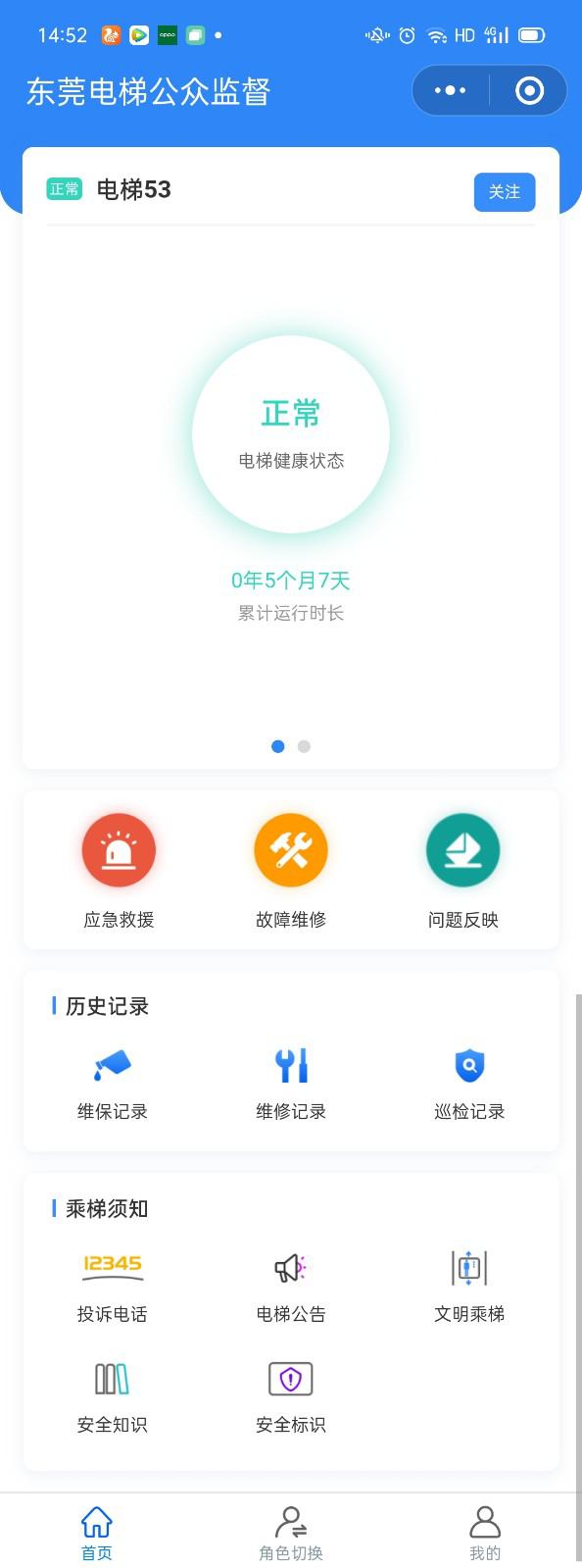 拿出手机扫一扫电梯上 " 东莞智慧电梯 " 的二维码,查看到电梯健康状态显示 " 正常 " 后,家住横沥瑞康花园的住户陈小姐放心地搭乘电梯出门了。万一遇到电梯故障等紧急情况,陈小姐还可以一键点击 " 应急救援 " 寻求专业救援,或点击 " 故障维修 " 将电梯故障情况上传系统。这仅仅是横沥镇 " 互联网 + 电梯 " 智慧监管平台在住宅小区中的日常应用场景。