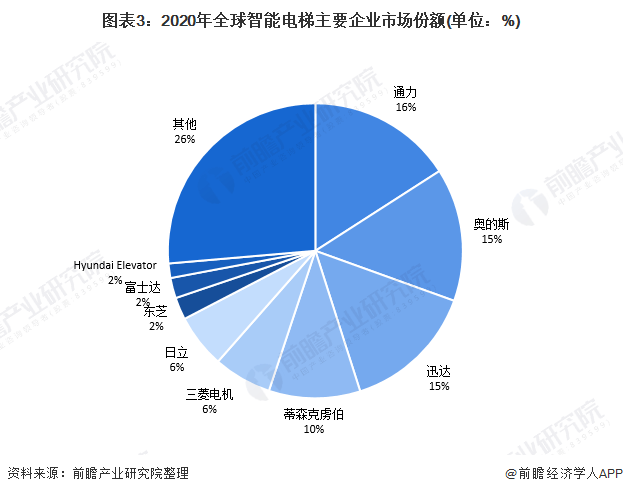 由于全球智能电梯行业在美国、日本、欧洲等国家起步,经过多年的发展,全球智能电梯市场呈现垄断竞争的基本格局。目前,整个全球市场基本被通力、奥的斯、迅达、蒂森克虏伯、三菱电机、东芝、日立、富士达、Hyundai Elevator等国际电梯龙头企业垄断瓜分。