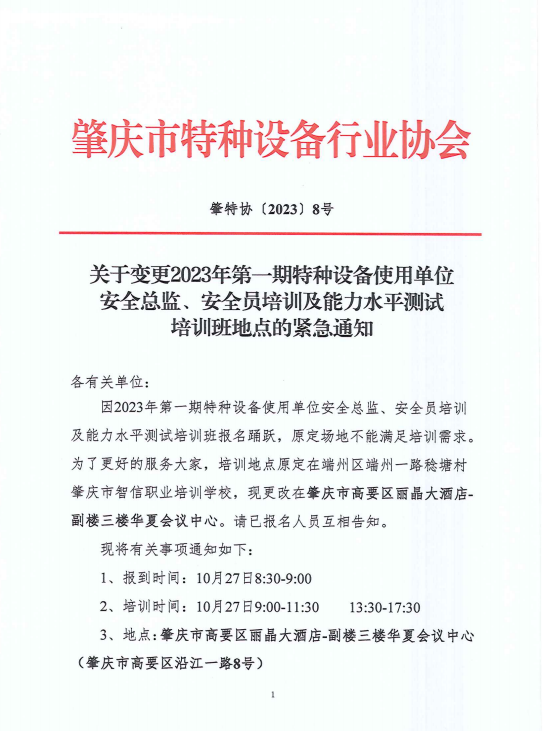 关于变更2023年第一期特种设备使用单位 安全总监、安全员培训及能力水平测试 培训班地点的紧急通知
