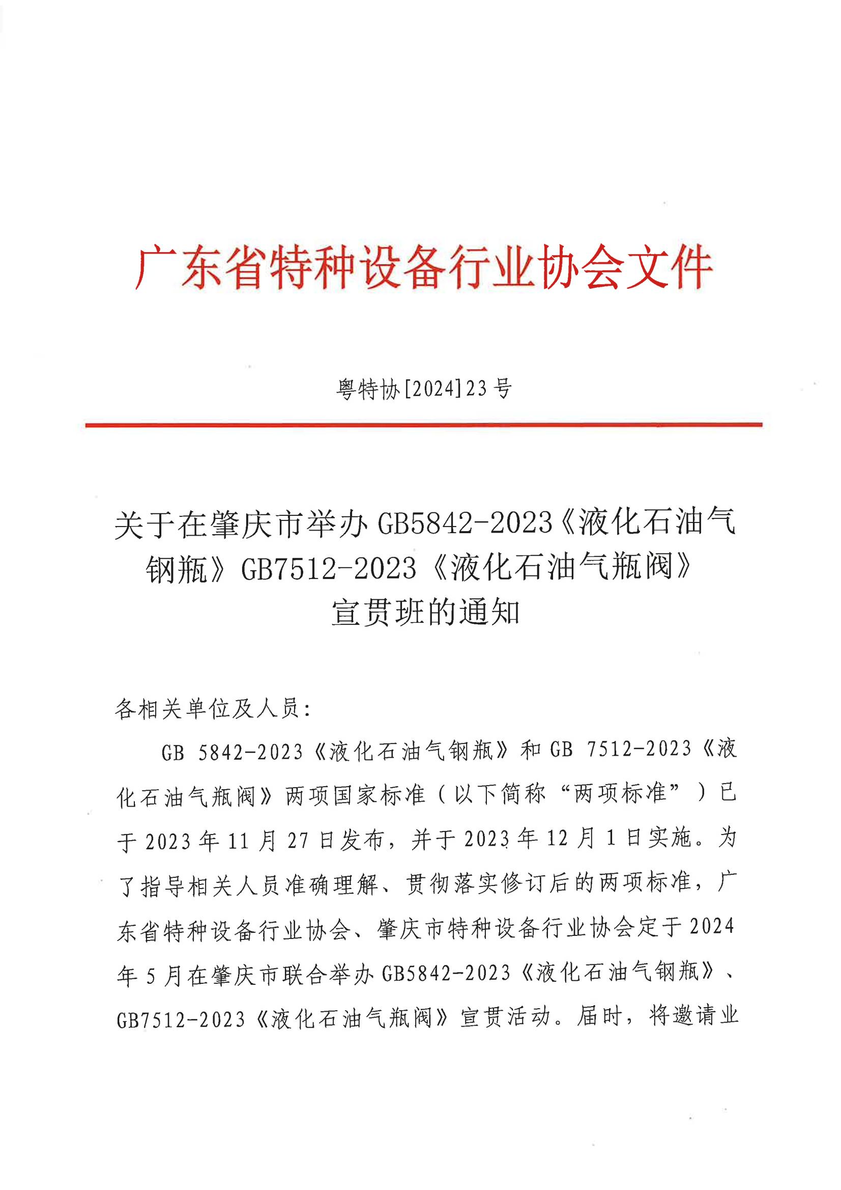 关于在肇庆市举办GB5842-2023《液化石油气钢瓶》GB7512-2023《液化石油气瓶阀》宣贯班的通知