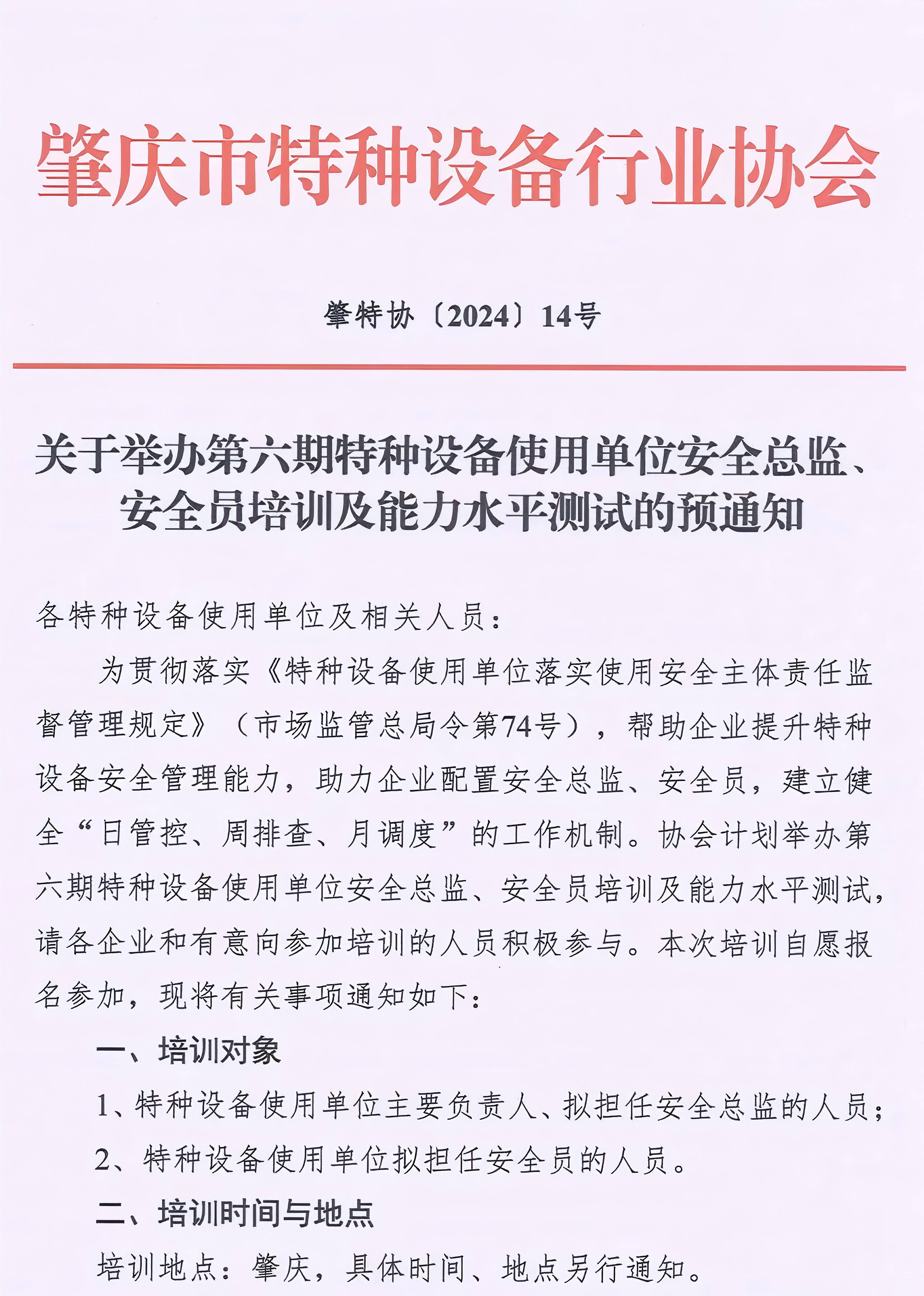 第六期使用单位安全总监、安全员培训及能力水平测试预通知