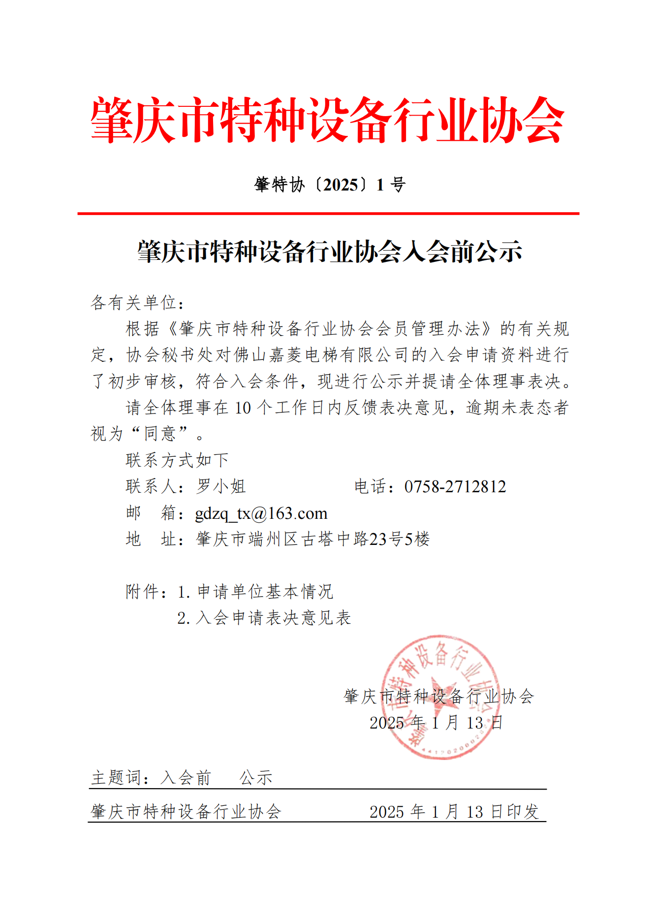 肇庆市特种设备行业协会入会前公示