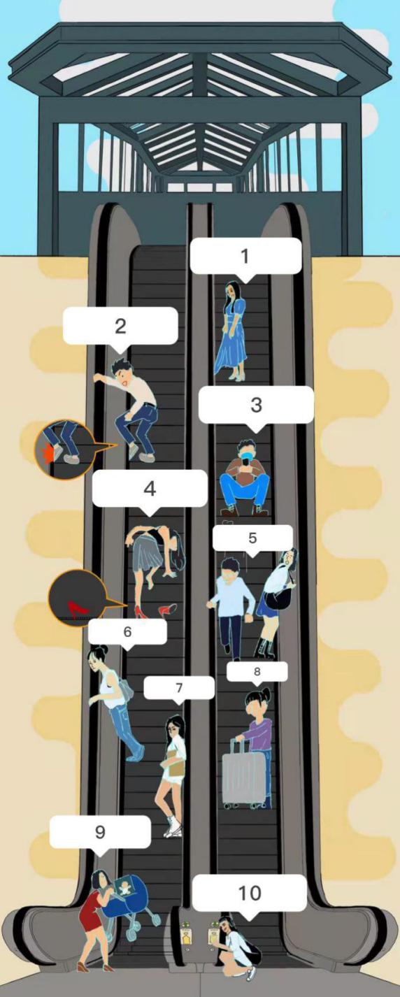 穿高跟鞋的乘客,请注意鞋跟与梯级的缝隙,防止出现鞋跟被梯级卡住的险情。