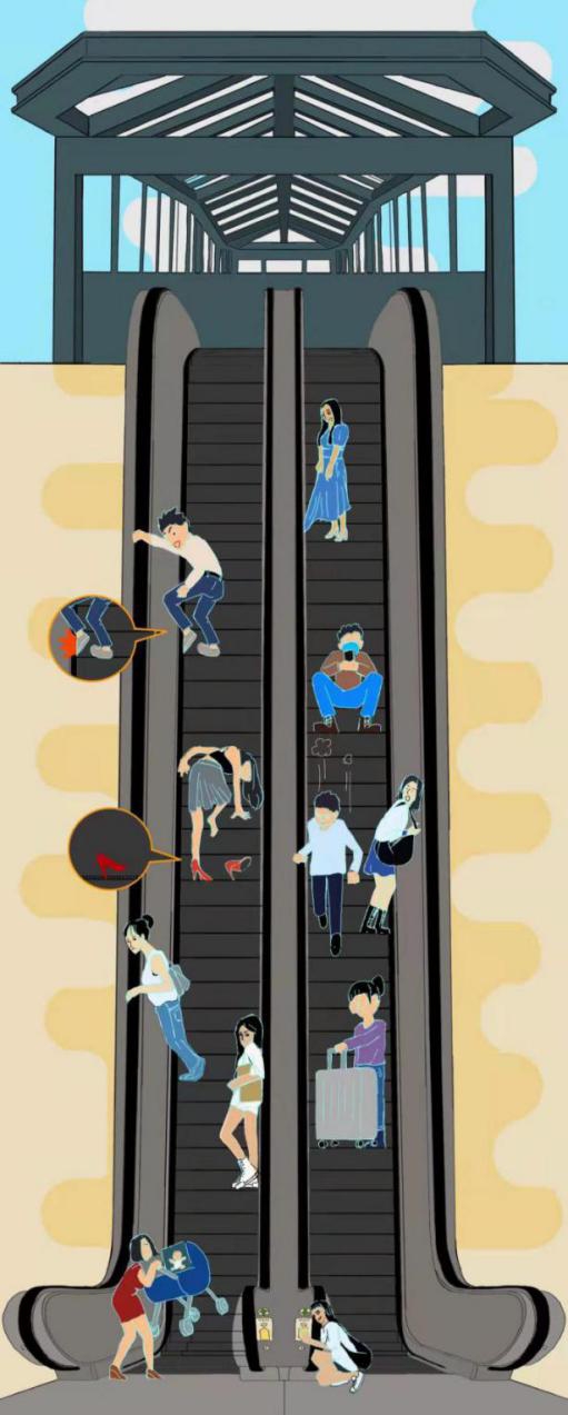 穿高跟鞋的乘客,请注意鞋跟与梯级的缝隙,防止出现鞋跟被梯级卡住的险情。
